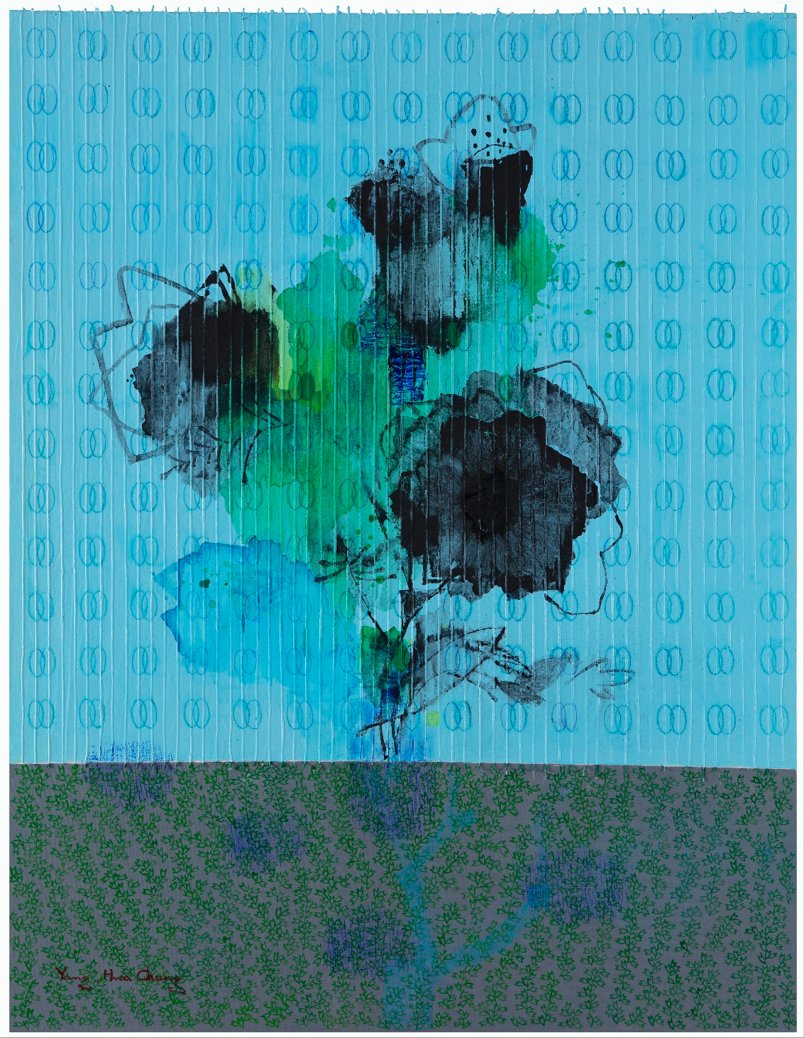 생명의빛으로-꽃.피어나다 116,8×91 / acrylic on canvas ,흑연 ,실 / 2024