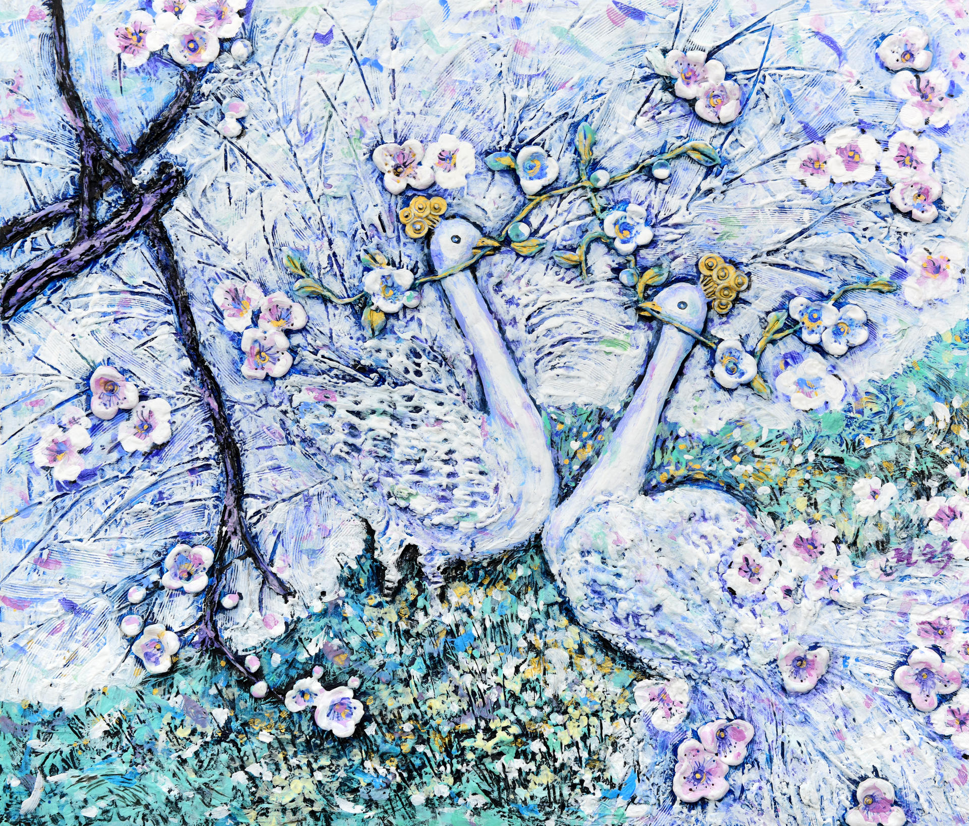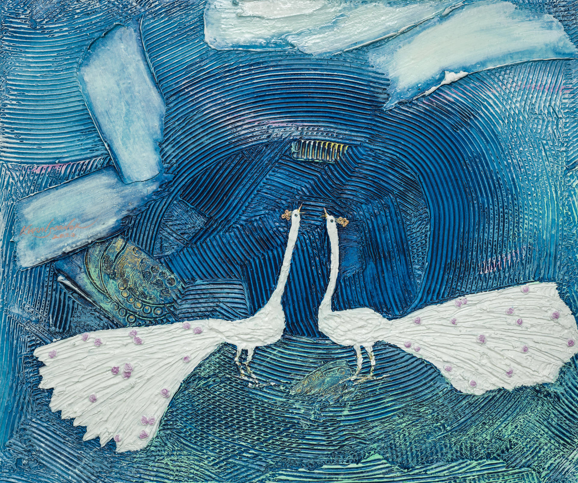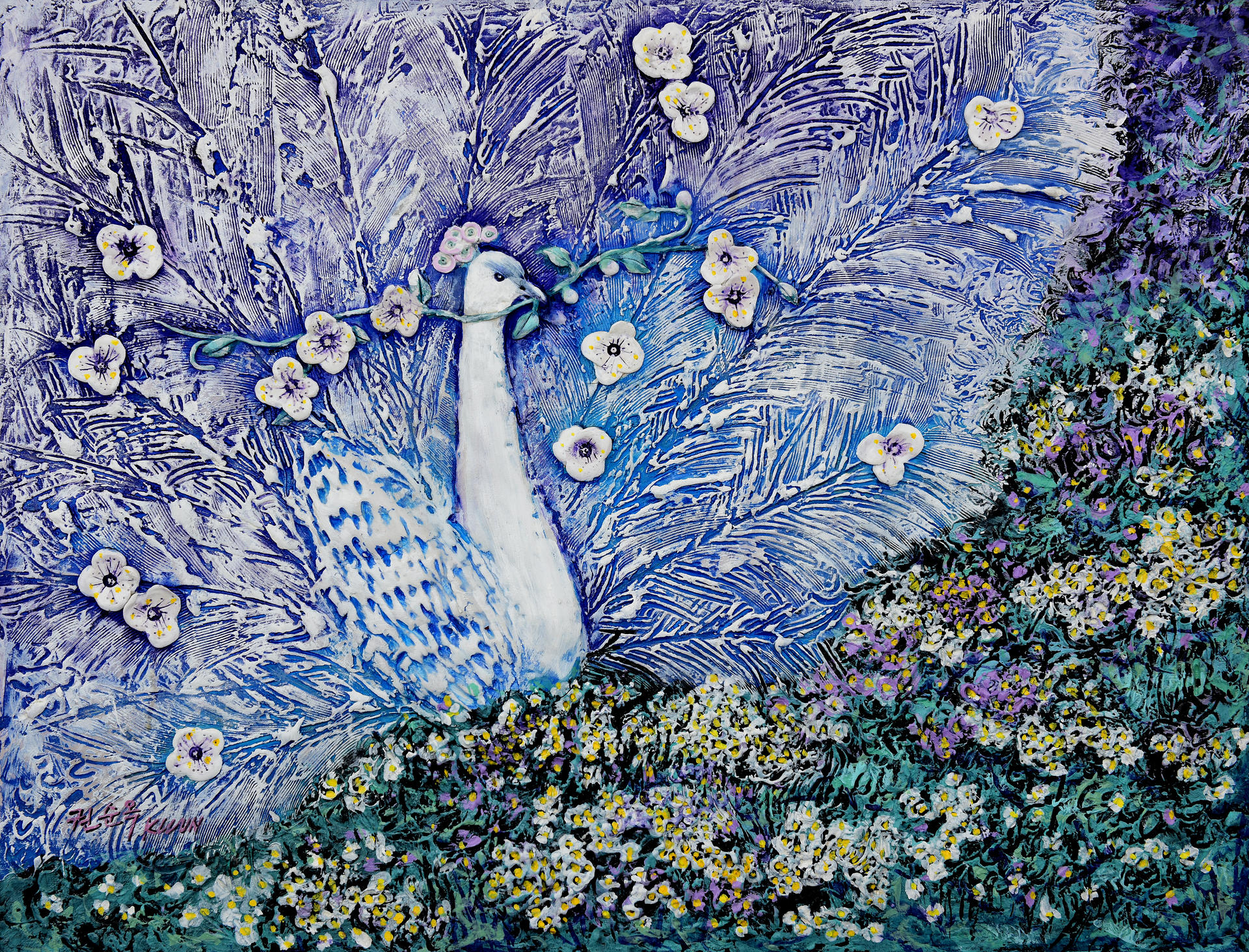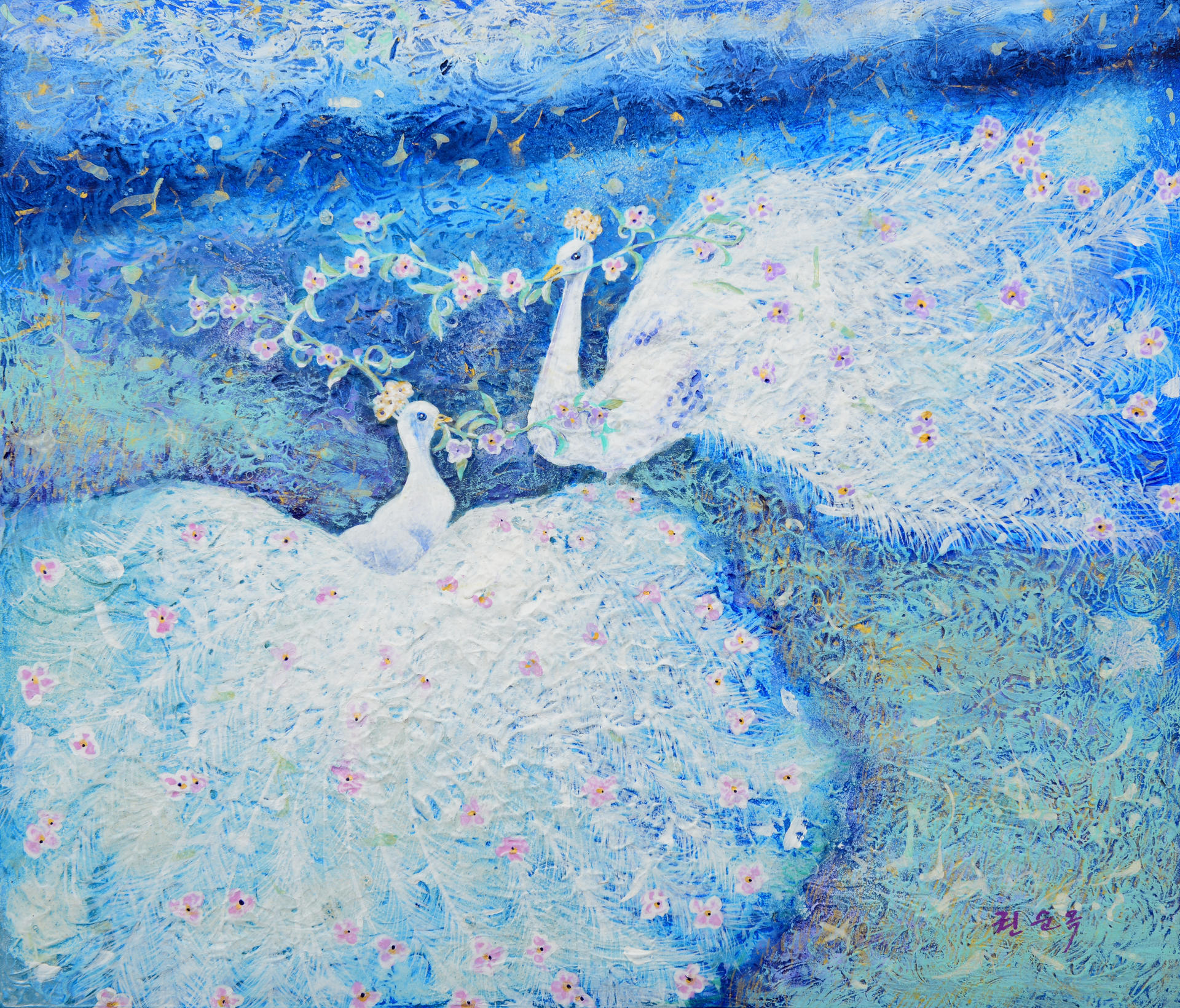 그 이후로 공작이 화면의 주인공으로 등장하기 시작했고, 스토리텔링이 시작되었다. 다리가 짧아 오리를 닮았던 모습이 점점 군더더기를 벗어버리고 나만의 공작으로 형상화되었다. 공작은 나의 삶 속에서 치유되지 않은 내 안의 작은 아이이다. 상처받아 찢어진 깃털을 스스로 치유하긴 어렵지만 상대의 깃을 다듬어 주기는 얼마나 쉬운가? 작은 꽃잎을 모아 주변을 돌보고 나니 어느덧 누군가에 의해 나도 치유가 되었음을 알게 된다. 공작 시리즈를 그리면서 많은 치유를 받았다. 송곳같이 날을 세우고 살아 주변의 사람도 힘들게 하고 자신도 힘들었는데, 어느 날부터 너무도 편안한 나를 보게 되었다. 내 안에 작은 아이를 돌보면서 일상이 행복해졌다. 주변 여건이 바뀐 것은 아무것도 없지만, 공작의 모습을 한 내 분신과 같이 과거를 추억하며 떠나는 여행으로 충분히 즐겁다. 함께하는 세상이 참 아름답다. 내 나이 일흔이 되었지만, 화면 속의 나는 영원히 늙지 않는 꿈많던 젊은 시절의 모습으로 머문다. 화가의 특권이다. 오늘도 나는 가고 싶은 곳, 하고 싶은 것을 상상하며 화판 위에서 부지런히 손을 움직인다.