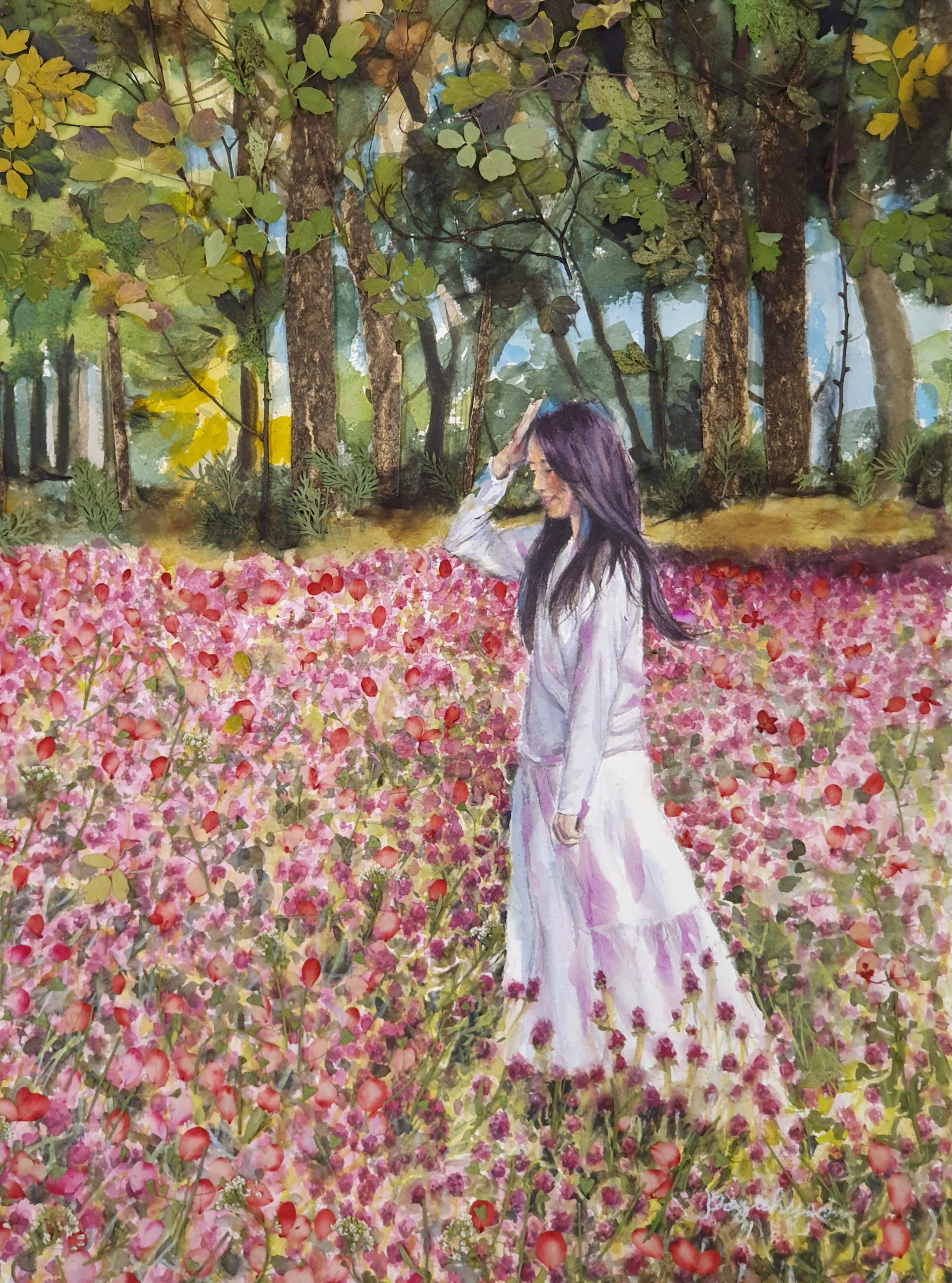 꽃밭에서 / 51 x 36cm / 종이위에 수채, 압화 / 2023