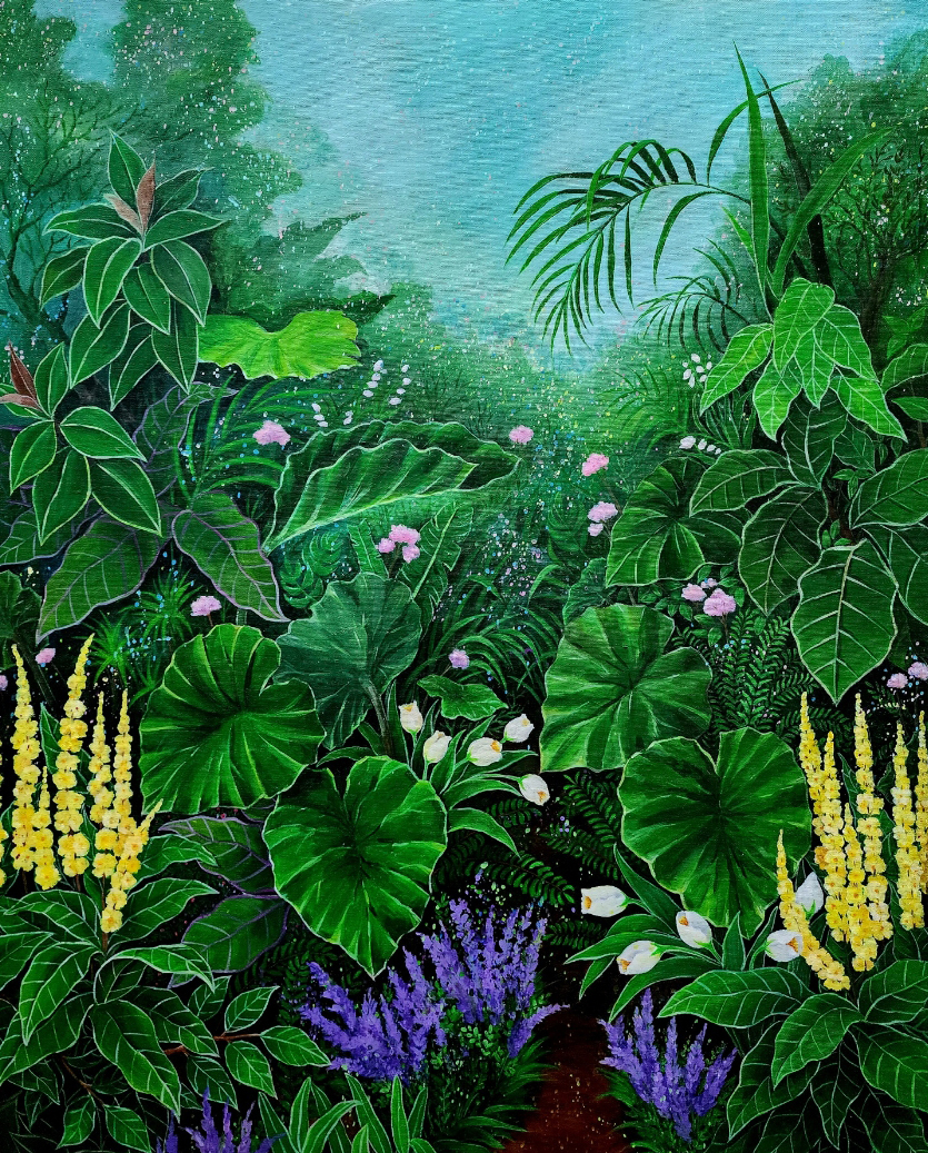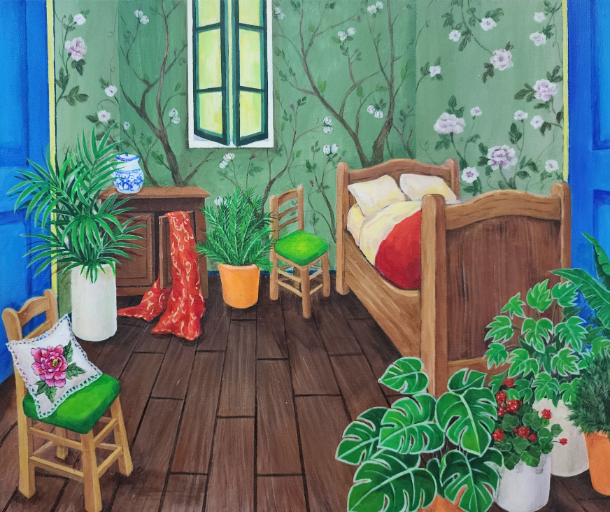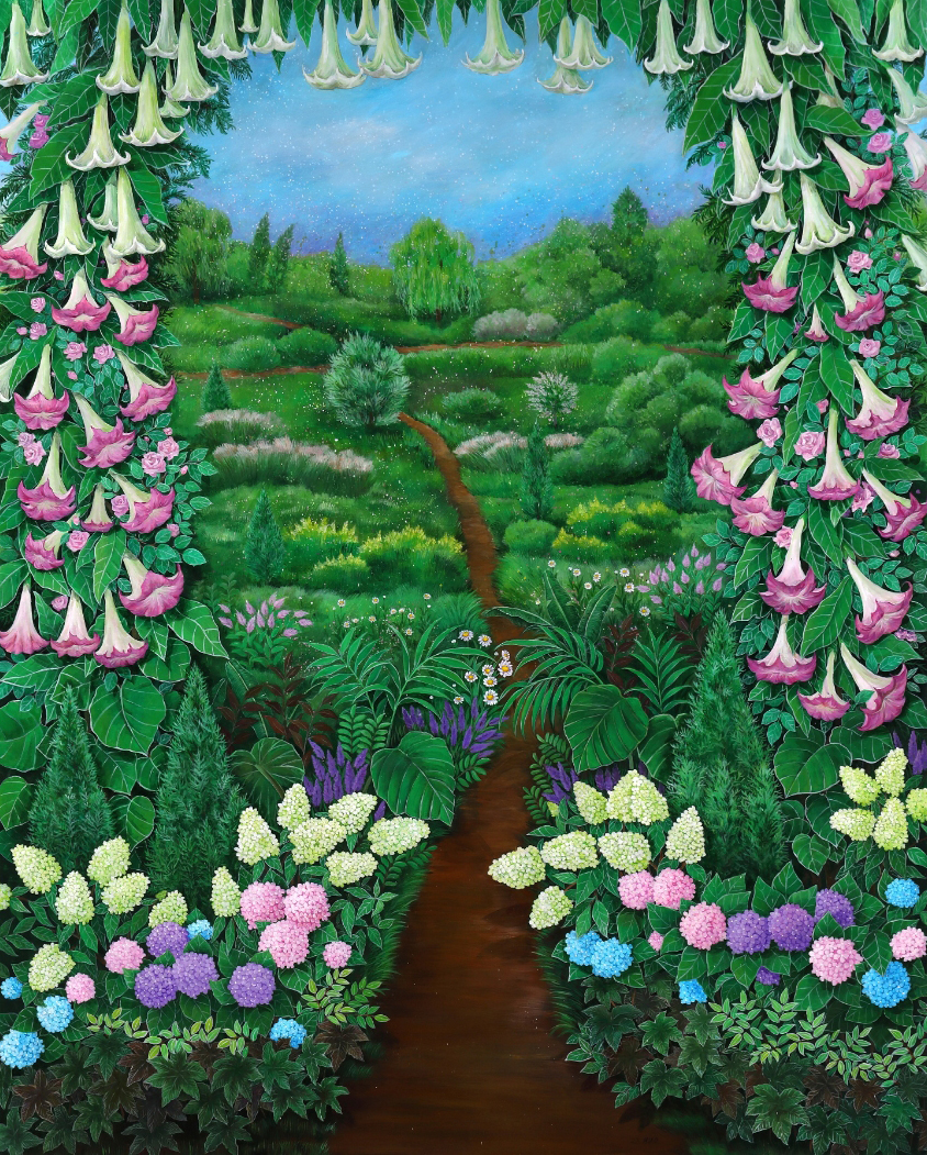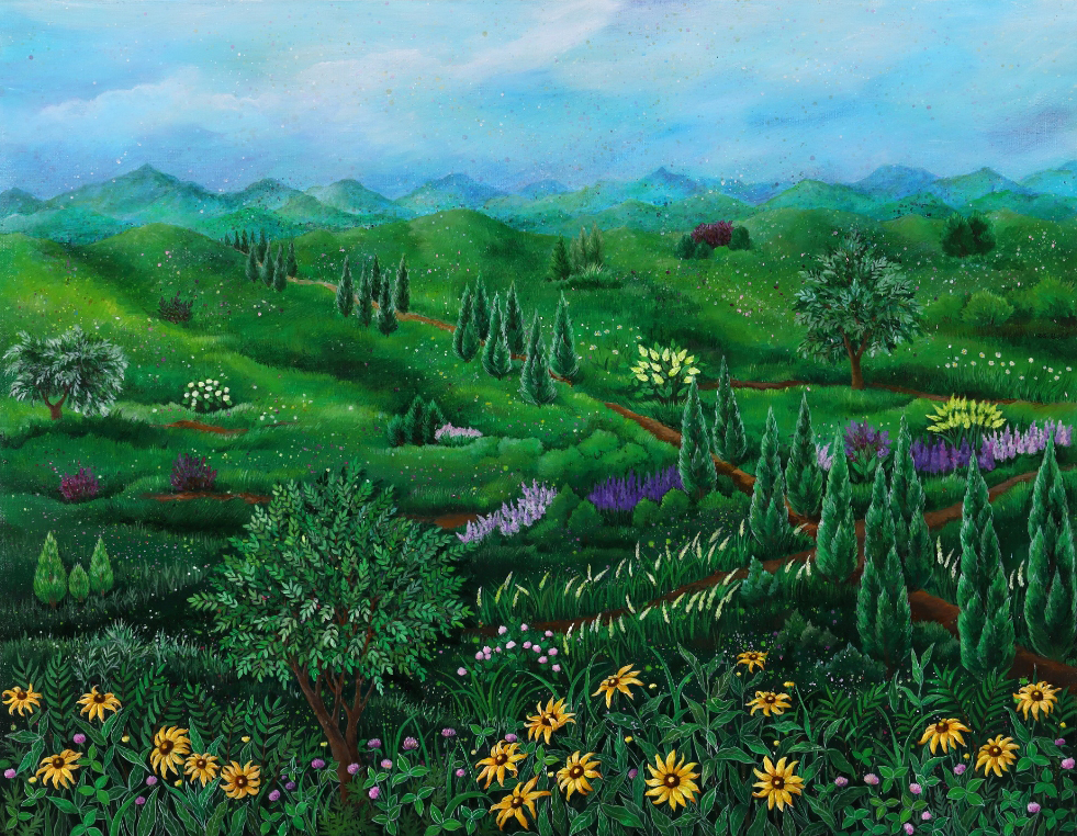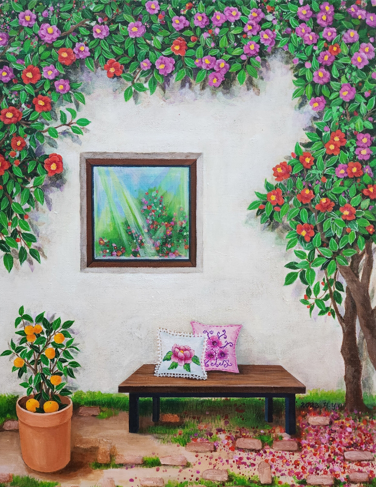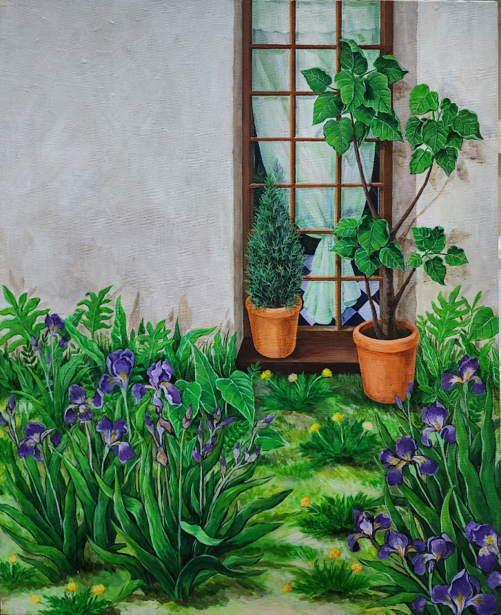 창밖으로 펼쳐진 푸른 하늘과 아름다운 꽃, 풀들은 자연의 환희와 생명의 흐름을 담고 있습니다.